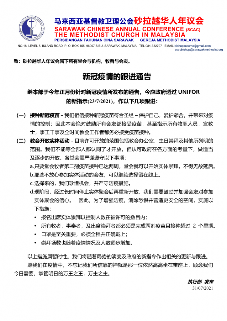 所有牧者,事奉者,及出席崇拜者都必须是完成两剂疫苗且接种超过 2 个星期。