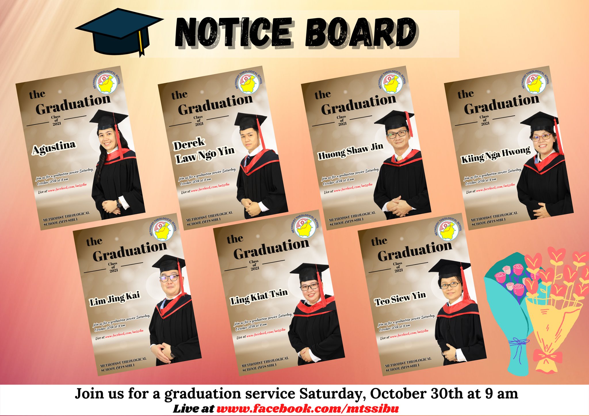 好消息!!诗巫卫理神学院即将于2021年10月30日(星期早上9时正,为2021年的毕业生举行第廿三届毕业典礼。诚心邀请您一起透过卫神面子书直播来见证毕业生的毕业礼!请记下此日期哟~~ 请多多留意我们的面子书 我们会继续更新最新消息和详情。