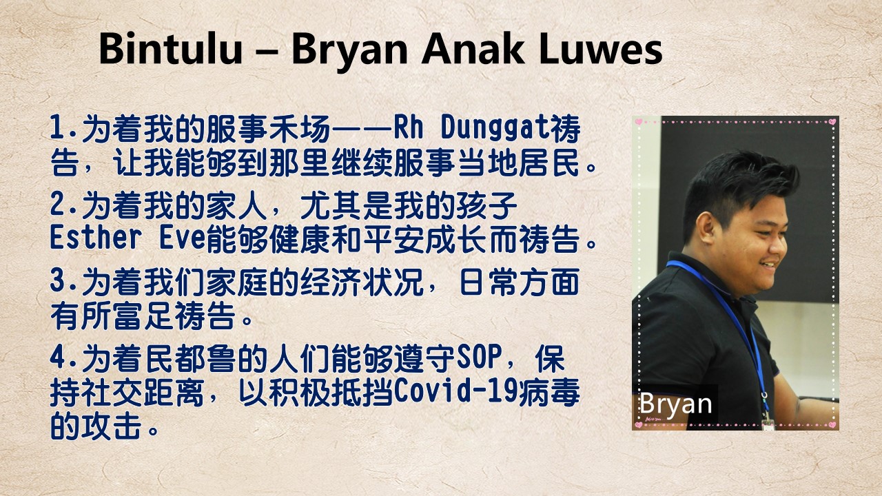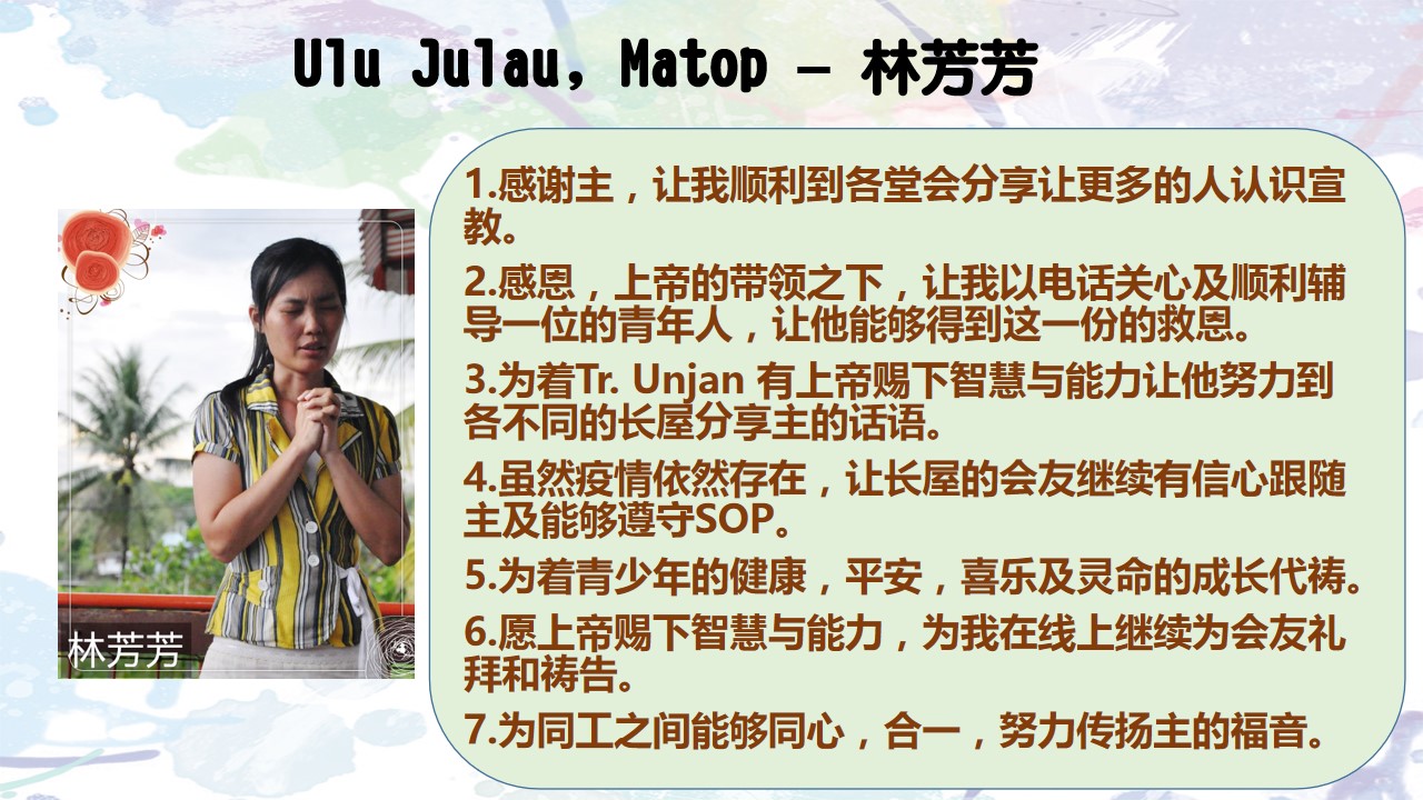 3.为着Tr. Unjan 有上帝赐下智慧与能力让他努力到各不同的长屋分享主的话语。