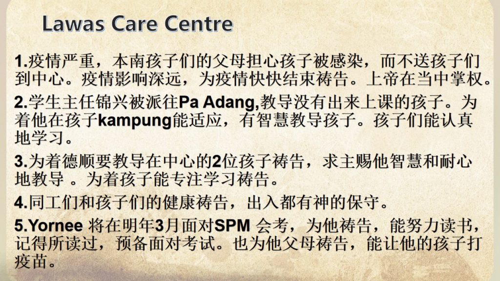1.为Samariang Care Centre的装修工作顺利完成向神献上感恩祷告。接下来,继续为这里的大小筹备工作祷告神 介入,每一件事情都顺着圣灵的带领,按照神的心意而行。