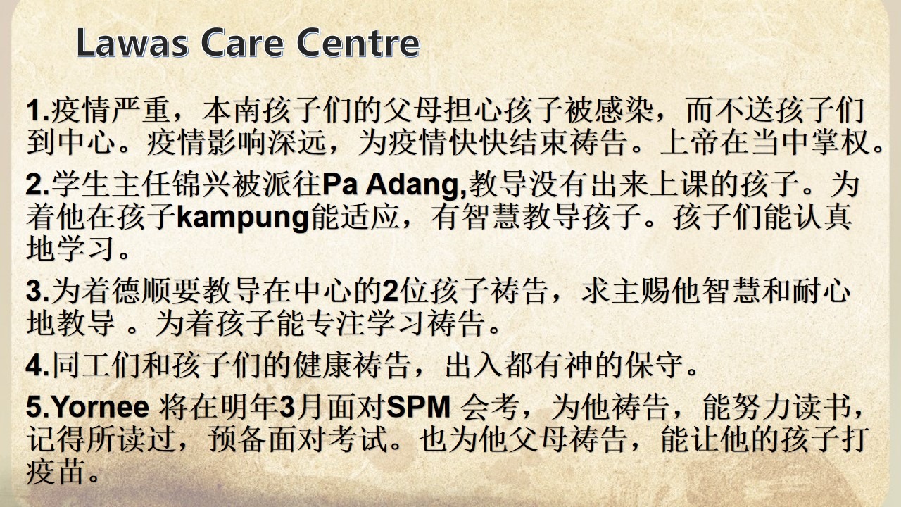 1.疫情严重,本南孩子们的父母担心孩子被感染,而不送孩子们到中心。疫情影响深远,为疫情快快结束祷告。上帝在当中掌权。