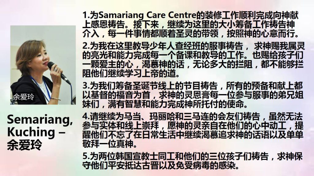 4.请继续为马当、玛丽哈和三马连的会友们祷告,虽然无法参与实体和线上崇拜,愿神的灵亲自在他们的心中动工,提醒他们不忘了在日常生活中继续渴慕追求神的话语以及单单敬拜一位真神。