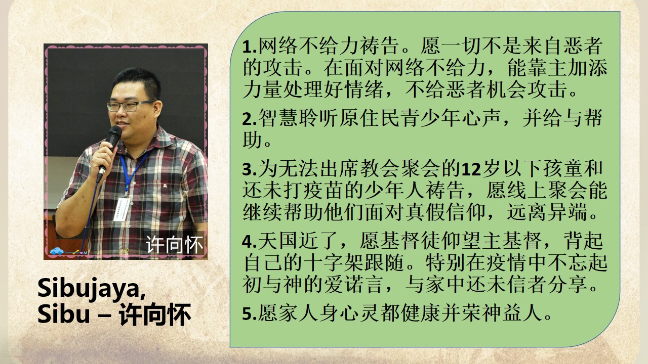 3.为无法出席教会聚会的12岁以下孩童和还未打疫苗的少年人祷告,愿线上聚会能继续帮助他们面对真假信仰,远离异端。