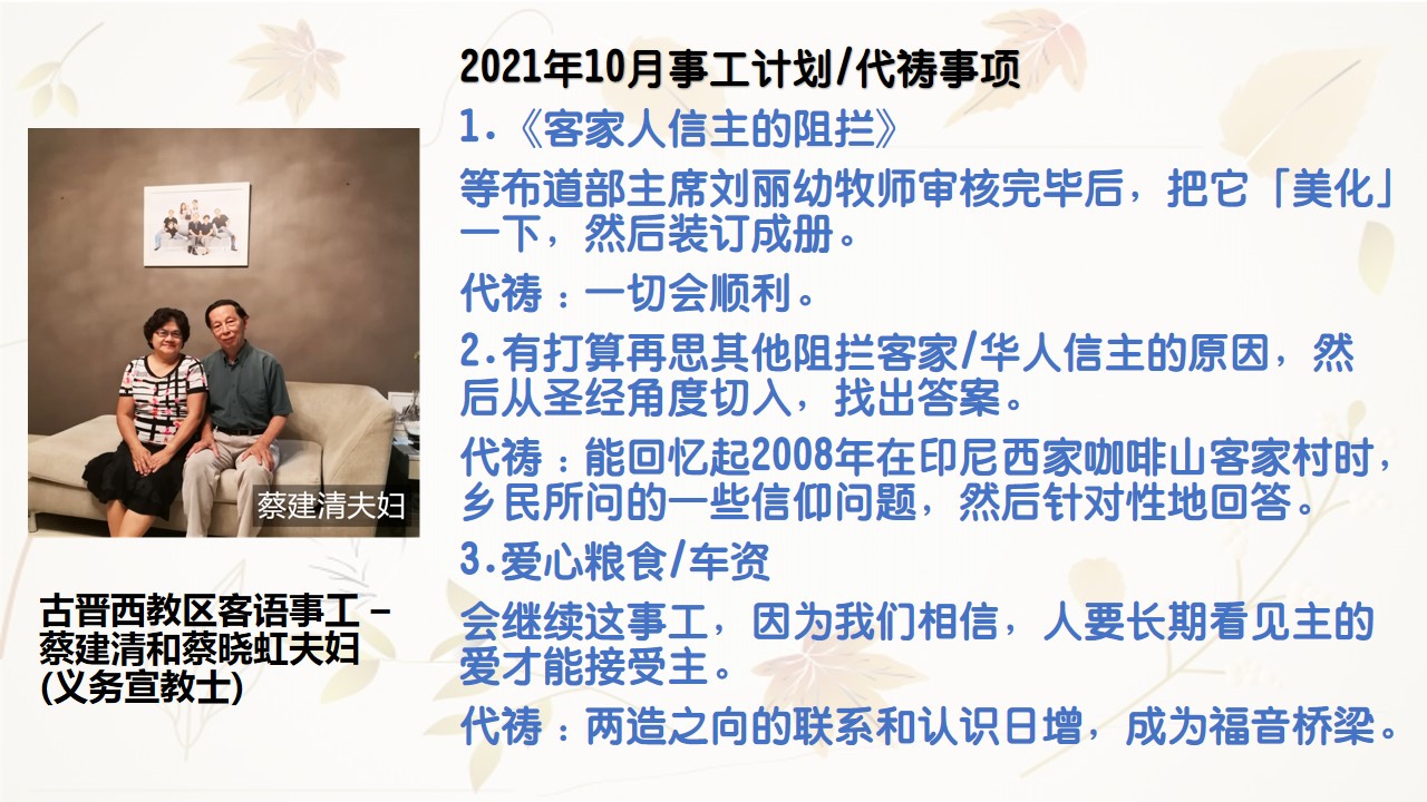 2.为10月27日刘会仙牧师来到泗教区检讨会及策划来年的事工。