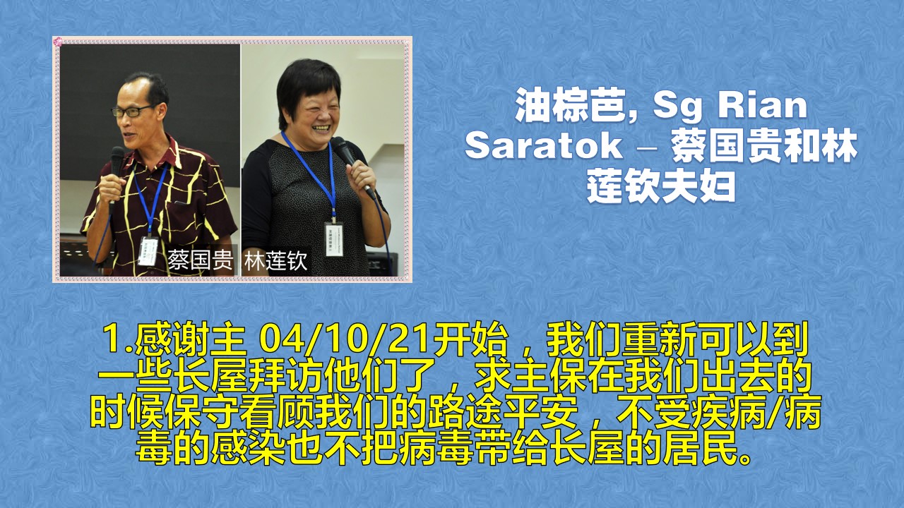 1.感谢主 04/10/21开始,我们重新可以到一些长屋拜访他们了,求主保在我们出去的时候保守看顾我们的路途平安,不受疾病/病毒的感染也不把病毒带给长屋的居民。