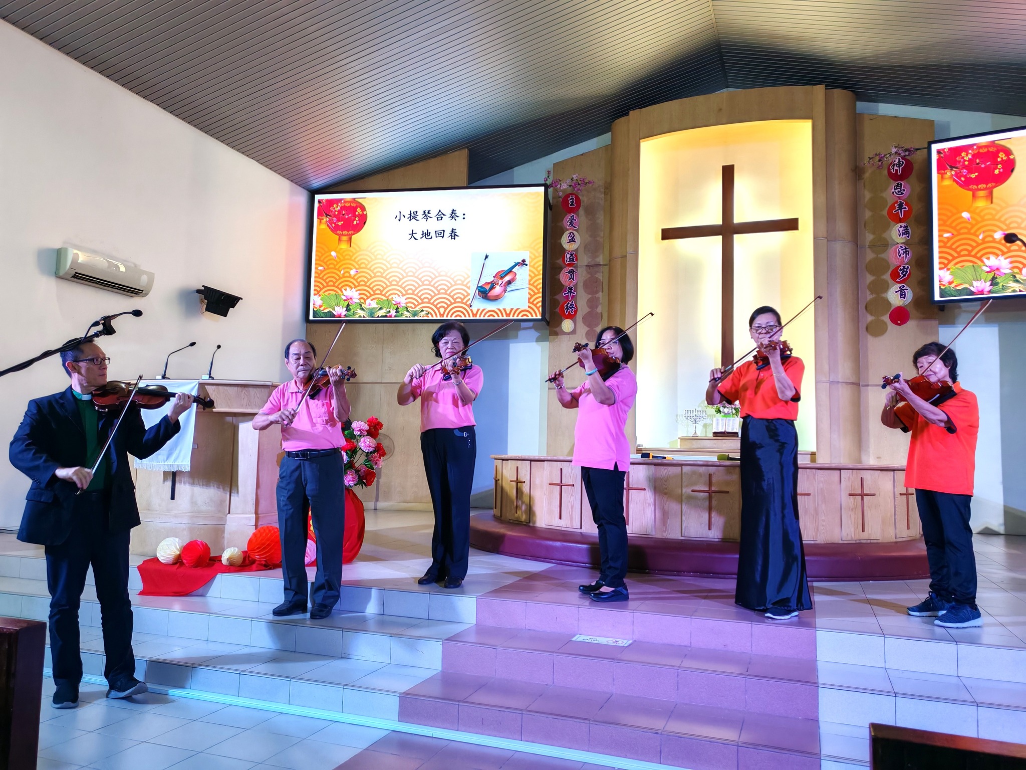 在开学礼中,旧曲重唱班上台献唱了一首歌《阳光和小雨》。小提琴班也在杨欣荣牧师的带领下,一同演奏了一首新年歌《大地回春》