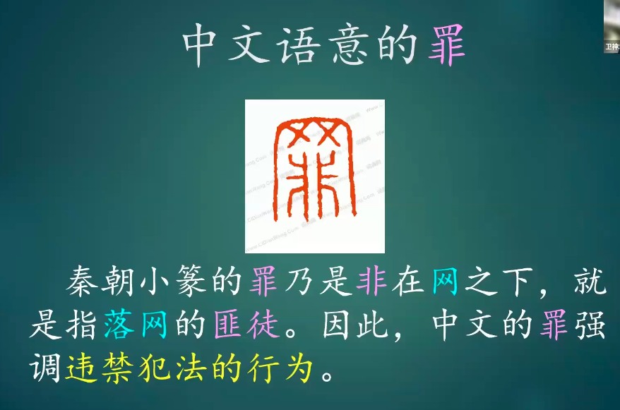 秦朝小篆的“罪“(最接近象形文的字)乃是”非“在”网“之下,指落网的匪徒。因此,在中文里”罪“语义乃违禁犯法的行为。希腊文的罪“hamartia”是指“没射中靶”的裁判用语,意味着没有人能达到上帝所设立作为人应有的标准。