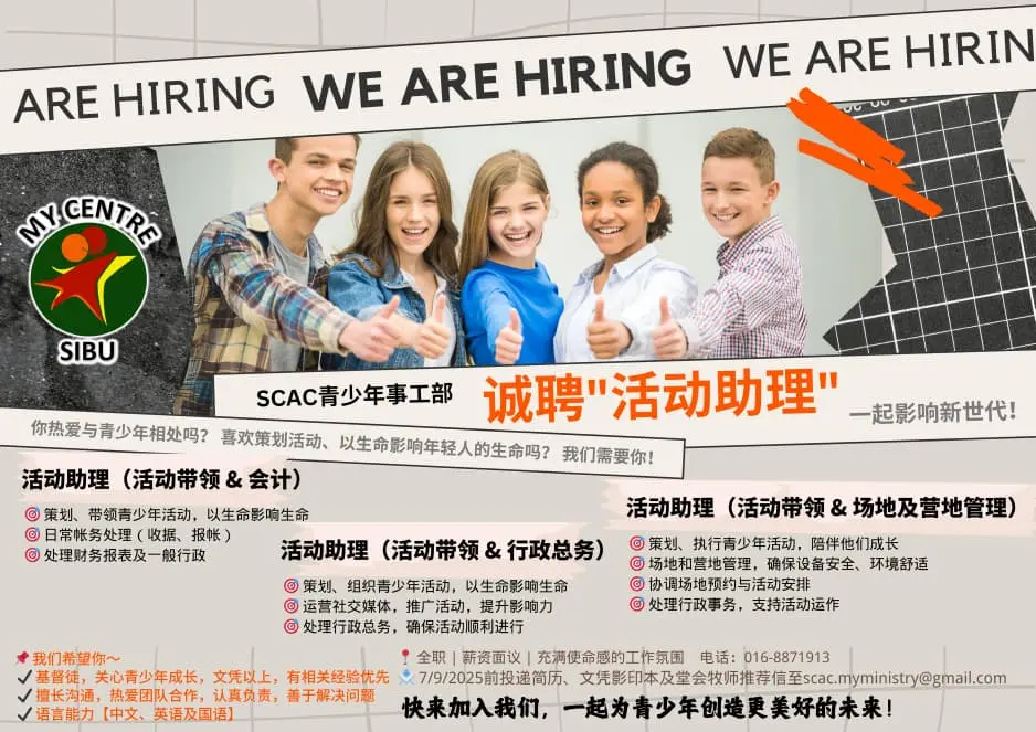 #SCAC青少年事工部 #招聘活动助理 #三语沟通 #青年工作机会 #影响新世代