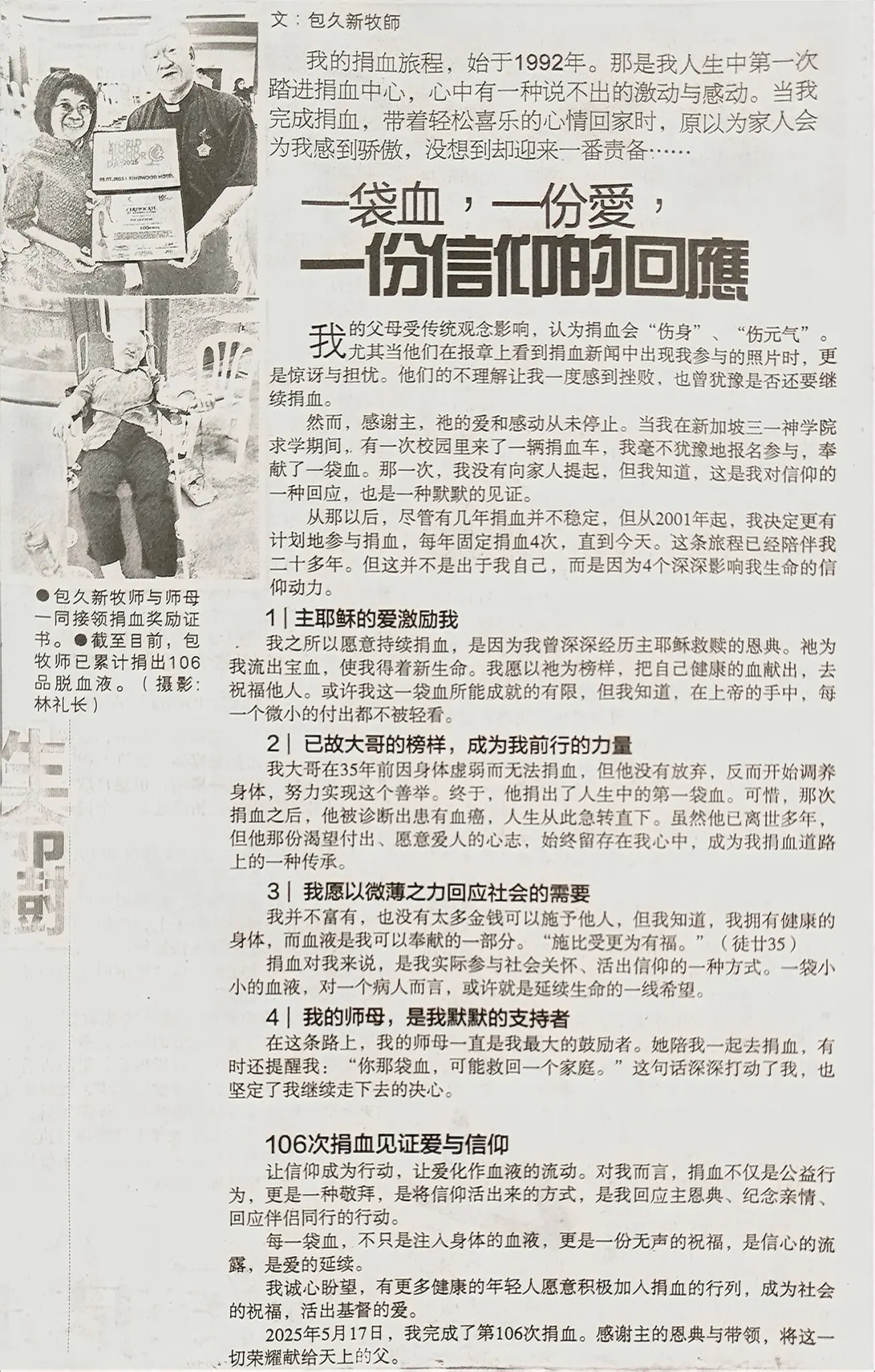 对许多人来说,捐血是一件令人望而却步的事。然而,有一位牧师在过去二十年间几乎风雨无阻地捐血,共达 106 次,一年四次的捐血活动从未缺席。这份坚持的的精神令人敬佩。那么,究竟是什么力量支撑着他坚持捐血呢?