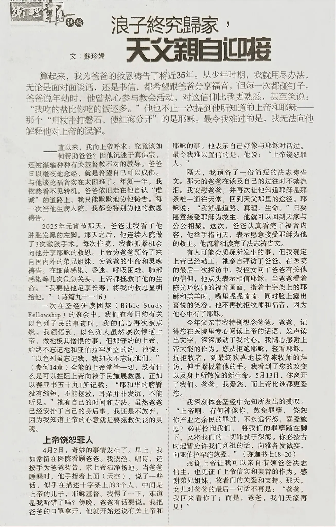 为家人祷告将近35年,希望他可以接受主耶稣基督的救恩。尽管过程并不容易,但作者却始终没有放弃。直到家人住院时,事情出现了转机——究竟发生了什么?让我们透过他的文章,一探究竟。