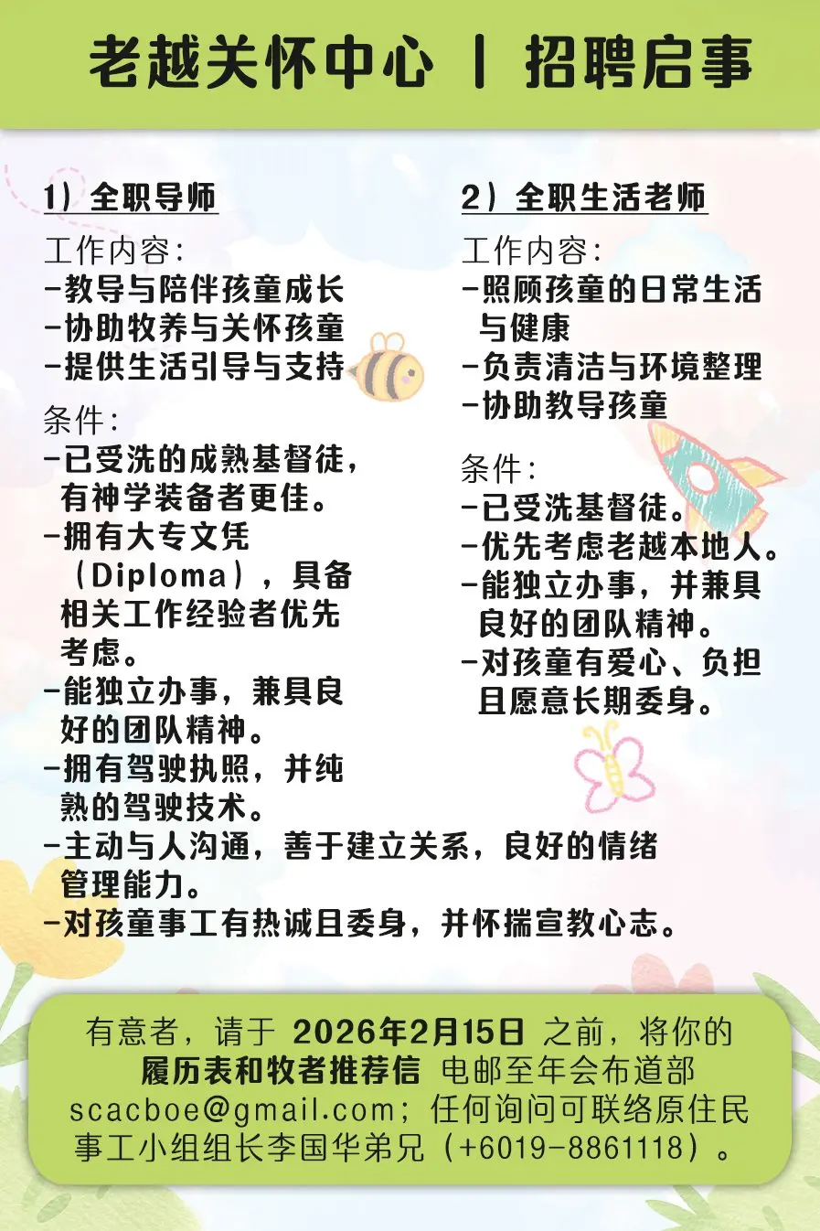 老越关怀中心招聘全职导师和全职生活老师 | 2026.1.16