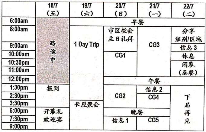 目的:激励及动员青年门徒活出大诫命及大使命,性质:以Church Game为主,加上主题信息,参访福音事工等。