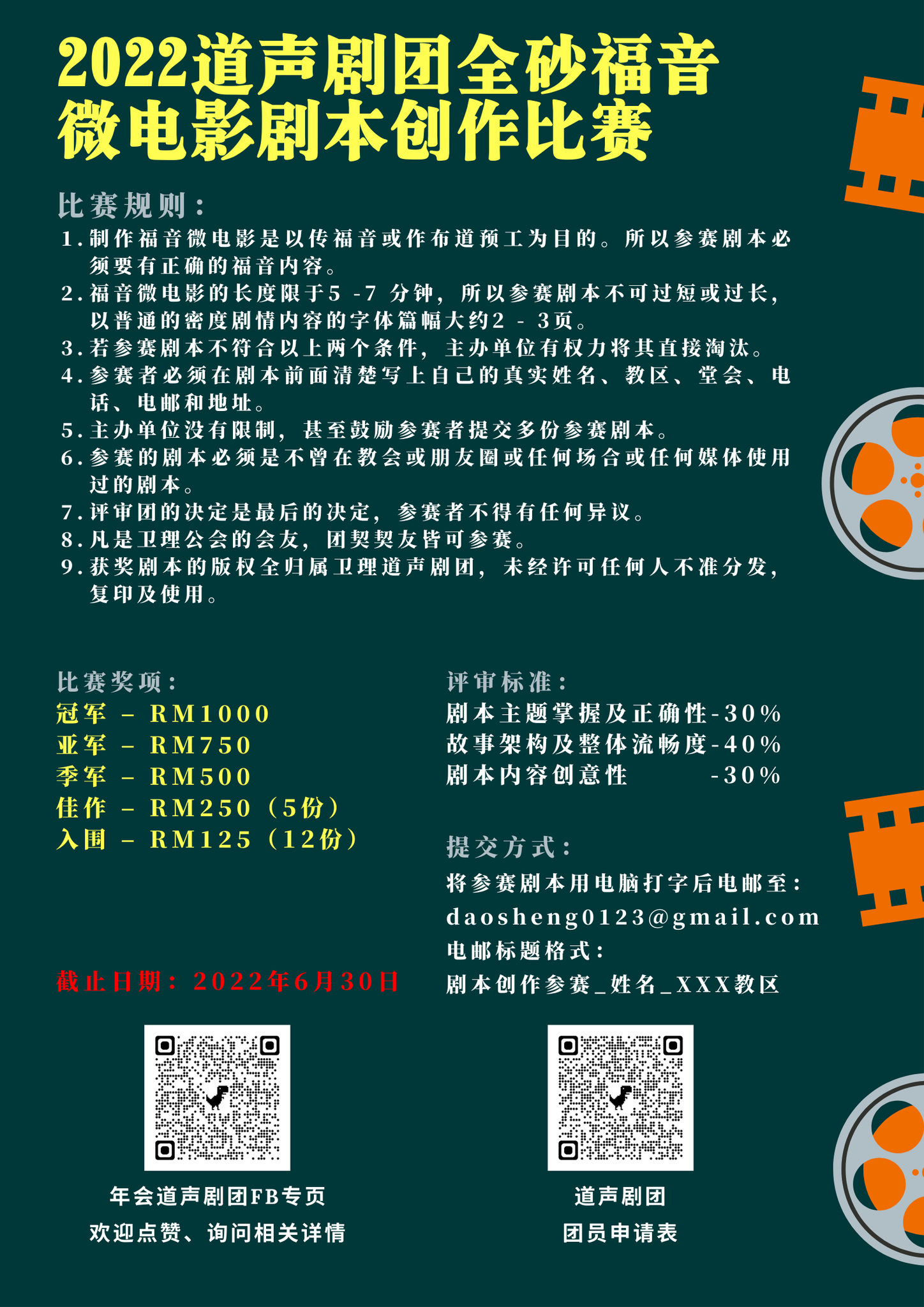 机会来了,“全砂福音微电影剧本”创作比赛来了——透过剧本创作,将脑子里的天马行空转化成文字吧!