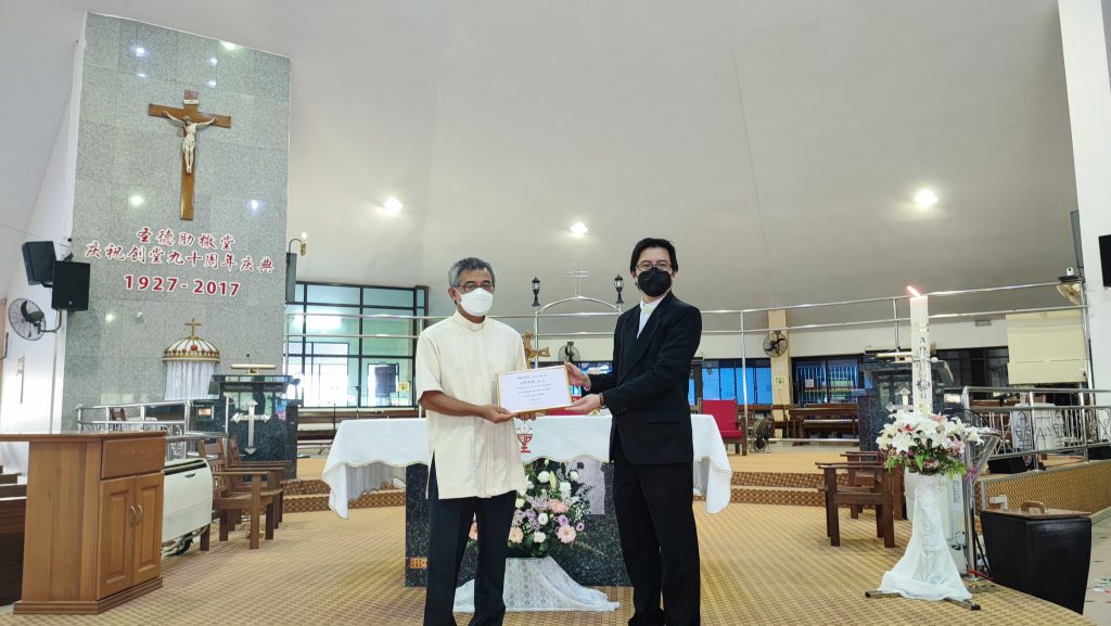 图2:诗巫联合教会主席刘本煌牧师(右)赠送纪念品予天主教诗巫教区主教许德光主教(左)时摄。