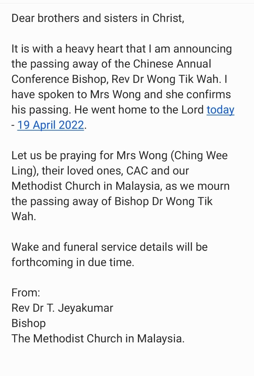 “谨以悲伤的心告知,我们所敬爱的黄迪华会督于今天中午12.15左右,因呼吸困难,安息主怀。丧礼事宜进一步安排,容后告知。愿我们以祷告扶持黄会督娘、家人及华人年议会。